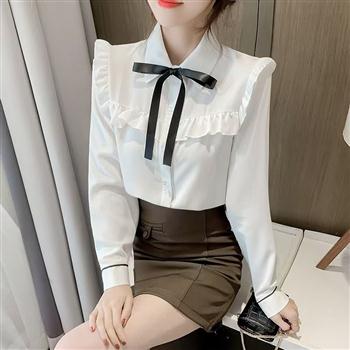 YF5905-图片色OL甜美气质长袖荷叶边系蝴蝶结宽松显瘦通勤雪纺衬衫