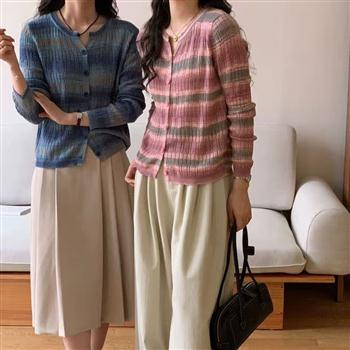 YF5906-(2色入内)秋冬彩虹提花编织圆领长袖排扣镂空薄款别致针织上衣