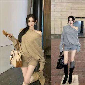 YF5907-(2色入内)性感时尚蝙蝠袖套头两穿露肩宽松显瘦慵懒风休闲针织上衣