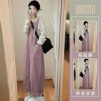 YF5909-图片色时尚吊带系扣口袋直筒休闲慵懒风小清新背带连体裤