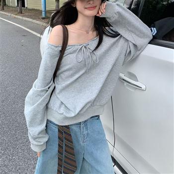 YF5910-港式一字肩抽绳系绳蝙蝠袖套头两穿大码上衣 慵懒风宽松显瘦卫衣