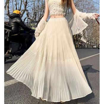 YF5911-(5色入内)优雅时尚松紧腰收腹百褶压折A字大摆飘逸雪纺中长款半身裙