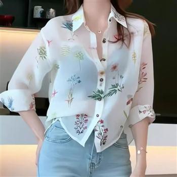YF5912-图片色韩版长袖翻领碎花系扣宽松大码小清新气质雪纺上衣