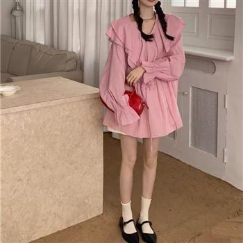 YF5453-(2色入内)秋装新款木耳边长袖叠式V领绑绳宽松简约雪纺衬衣