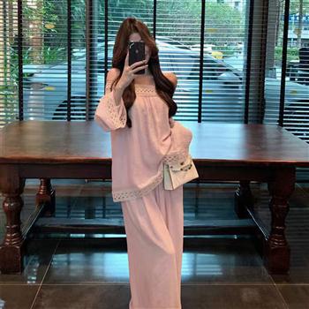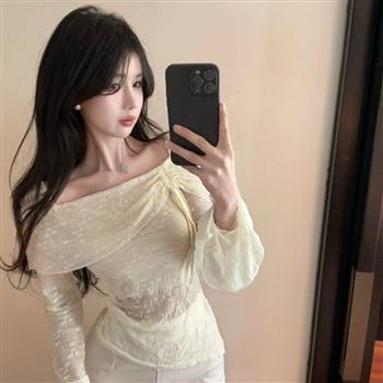 YF5454-(3色入内)早秋百搭一字肩镂空设计长袖露肩大码蕾丝拼接显瘦雪纺衫
