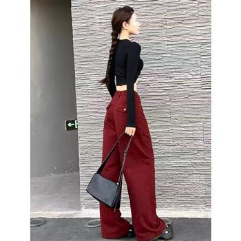 YF5456-图片色韩版春秋百搭红色个性高腰直筒坠地感慵懒风拖地牛仔裤