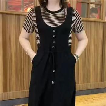 YF5457-(2色入内)韩版假两件夏季新款排扣绑绳收腰弹力显瘦冻龄连衣裙