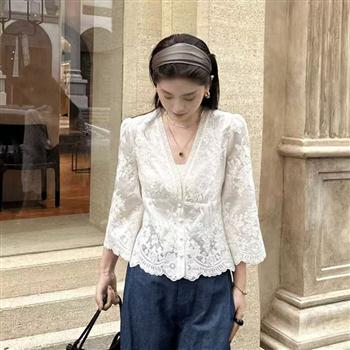 YF5458-图片色甜美时尚七分袖V领收腰提花蕾丝别致春秋新款上衣