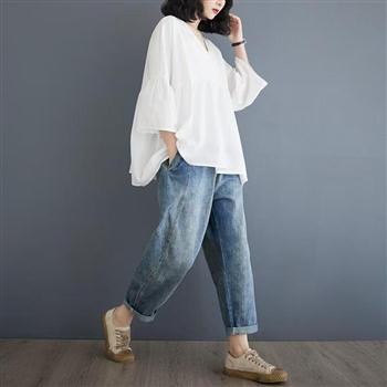YF5460-(2色入内)韩版蝙蝠袖套头褶析A字七分袖短款纯色简约上衣