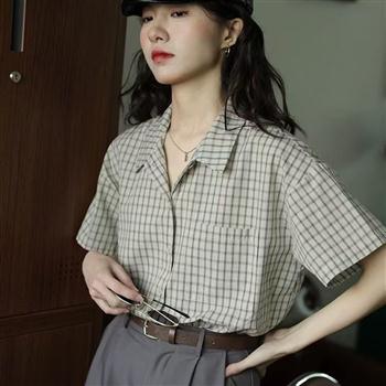 YF5461-(2色入内)夏季小清新POLO领短袖复古格子衫 英伦风杏色设计上衣
