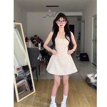 YF5465-图片色小可爱吊带方领抹胸收腰波点设计感夏季小个子别致连衣裙