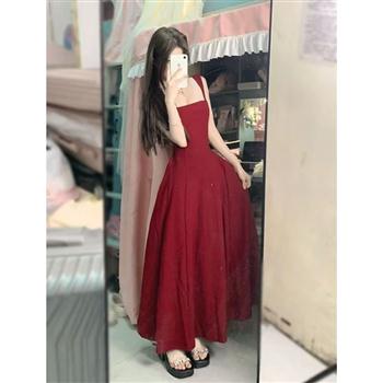 YF5466-图片色红色赫本风吊带方领收腰褶折后背镂空过膝中长款夏季长裙