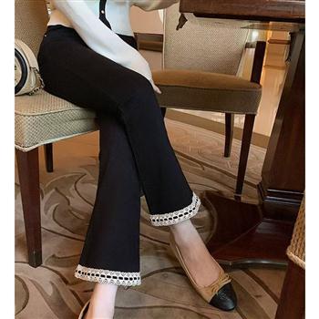 YF5467-图片色韩版微喇叭蕾丝边设计松紧腰弹力包臀显瘦黑色九分裤
