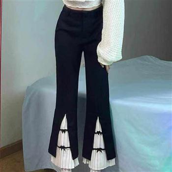 YF5468-图片色夏季高腰微喇叭开叉百褶系蝴蝶结设计小众夏季九分西裤