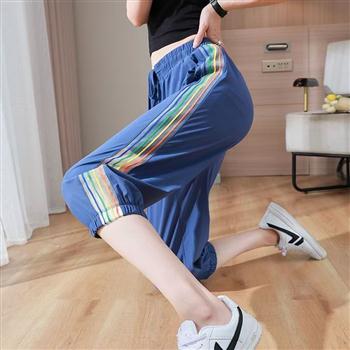 YF5480-(2色入内)夏季运动时尚侧彩带条纹设计松紧腰绑绳束腿七分裤