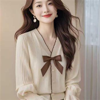 YF5481-图片色甜美时尚木耳边撞色V领系蝴蝶结珍珠扣设计别致雪纺衫