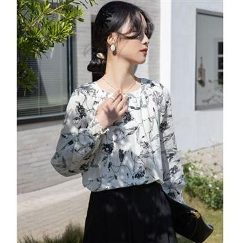 YF5484-图片色小清新圆领套头泡泡袖水墨印花轻奢设计感春秋雪纺衫