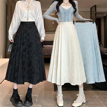 YF5485-(3色入内)民族风收腰褶折A字大摆提花中长款春秋新款半身裙