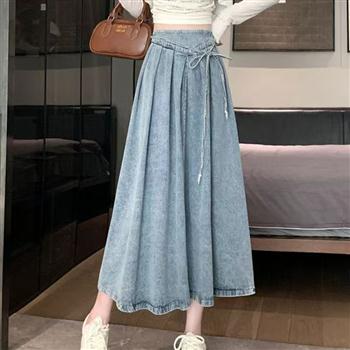 YF5486-(2色入内)牛仔半身裙新款 秋季高腰绑绳褶折长款复古洗水牛仔裙