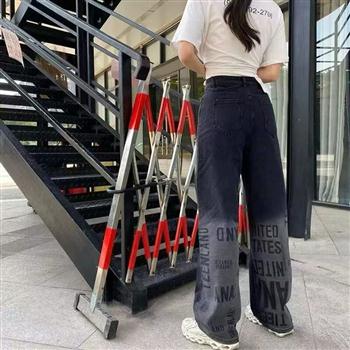 YF5487-(2色入内)港式系扣高腰不规则字母印花渐变设计嘻哈风拖地牛仔裤