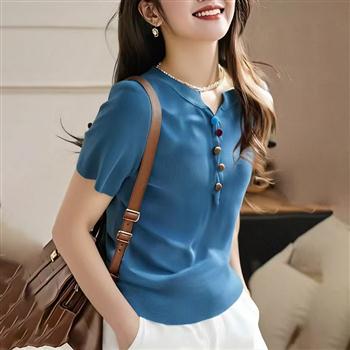YF5489-(4色入内)早秋圆领短袖彩色纽扣弹力收腰显瘦短款正肩针织上衣