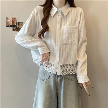 YF5473-(2色入内)港式春秋长袖翻领蕾丝拼接宽松大码条纹显瘦上衣