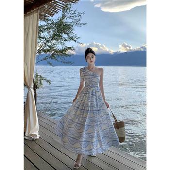 YF5476-图片度假风单肩性感松紧腰插袋油画印花大摆优雅气质连衣裙