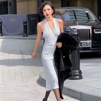 YF5477-图片色夏季复古波点大露背围脖收腰显瘦优雅名媛气质连衣裙
