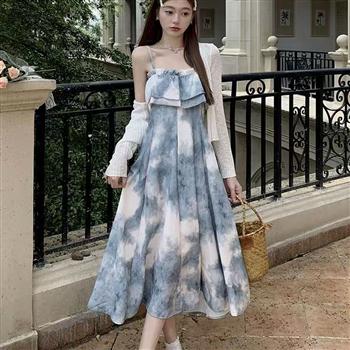 YF5479-图片色韩版夏季吊带荷叶边束胸一字肩设计宽松藏肉水墨扎染连衣裙