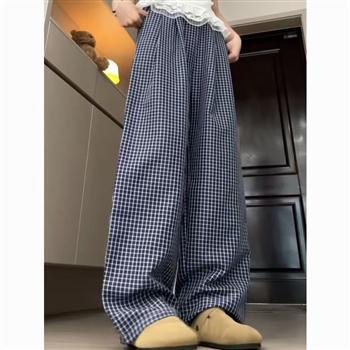 YF5415-图片色复古格子休闲长裤 慵懒风夏季直筒坠地感阔腿拖地裤