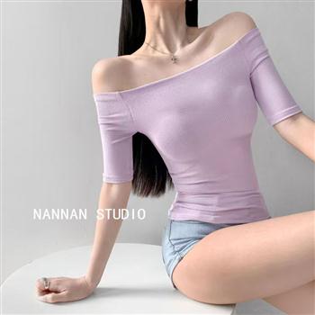 YF5418-(2色入内)辣妹夏季一字肩弹力收腰露脐短款白色简约气质上衣