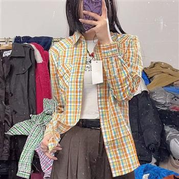 YF5419-(4色入内)春秋撞色美式新款长袖翻领宽松大码复古格子秋装上衣