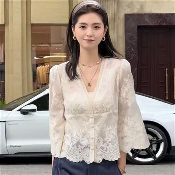 YF5420-图片色优雅时尚V领拼接提花透气七分袖设计新款蕾丝外搭上衣
