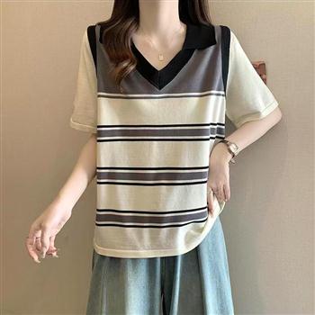 YF5422-(2色入内)韩版拼色条纹小众设计短袖POLO领冰丝清爽夏季上衣