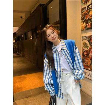 YF5424-图片色港式春秋百搭长袖翻领慵懒风蓝色格子复古显瘦衬衣