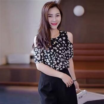 YF5426-(6色入内)夏季小心机镂空短袖圆领洋气印花显瘦雪纺衫 时尚上衣