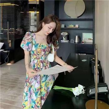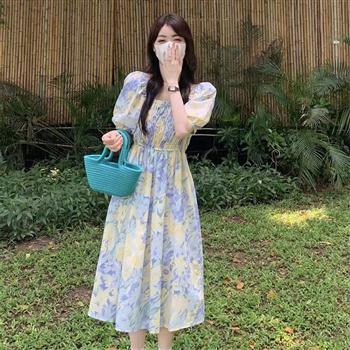 YF5434-(4色入内)森系甜美泡泡袖方领松紧腰碎花中长款夏季新款ins连衣裙