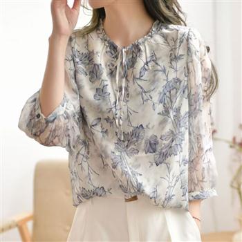 YF5429-图片色甜美时尚灯笼袖木耳边抽绳碎花宽松大码法式通勤雪纺上衣