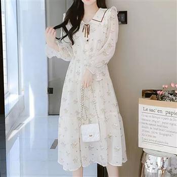 YF5432-图片色夏季新款优雅气质娃娃领系蝴蝶结收腰碎花桔梗风雪纺连衣裙