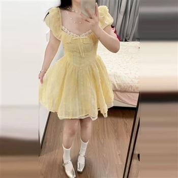 YF5437-图片色复古法式短袖花边系蝴蝶结收腰褶析提花蕾丝蓬蓬连衣裙