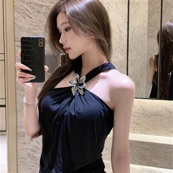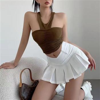 YF5439-(2色入内)性感时尚辣妹挂脖开叉抹胸收腰小心机设计夏季新款上衣