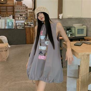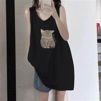 YF5442-(3色入内)休闲时尚无袖A字中长款可爱猫咪印花简约百搭上衣潮