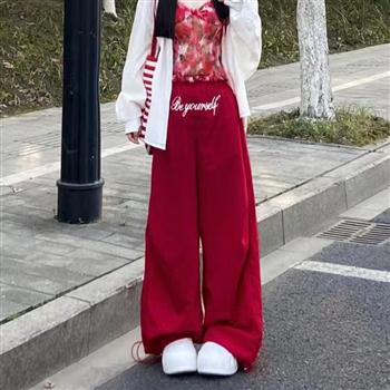 YF5444-图片色港式松紧腰字母松紧腰直筒坠地感薄款学院风休闲裤