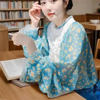 YF5447-图片色小清新碎花雪纺泡泡袖立领蕾丝拼接复古设计感别致上衣