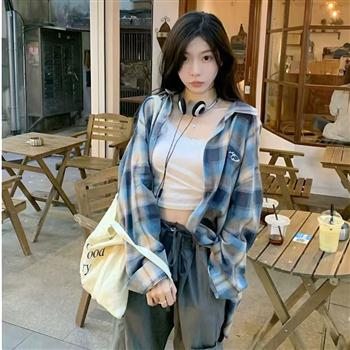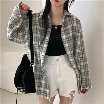 YF4490-(3色入内)春夏百搭格子衬 休闲长袖POLO领宽松大码慵懒风上衣