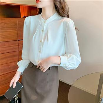 YF4491-图片色韩版优雅时尚褶折立领系扣设计长袖大码白色简洁别致雪纺衬衫