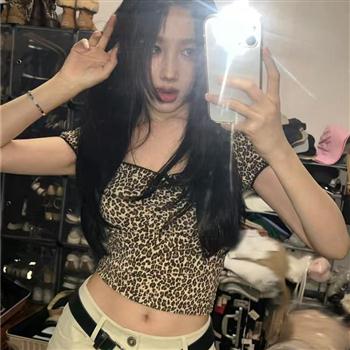 YF4492-图片色时尚性感豹纹印花短袖方领弹力紧身短款T恤 辣妹露脐小衫