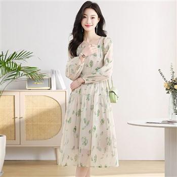 YF4493-图片色甜美碎花新款连衣裙 泡泡袖褶折方领后背绑绳雪纺连衣裙