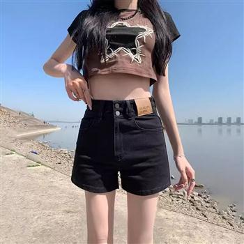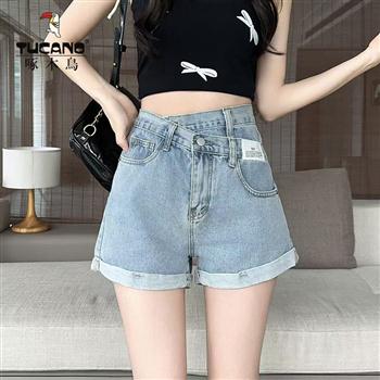 YF4494-(2色入内)港式不规则高腰贴标卷边设计阔腿短裤 辣妹A字牛仔裤