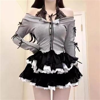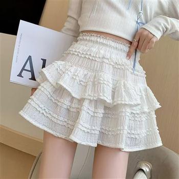 YF4510-(3色入内)小可爱荷叶边A字防走内裤松紧腰纯色蕾丝半身裙 日系蓬蓬裙